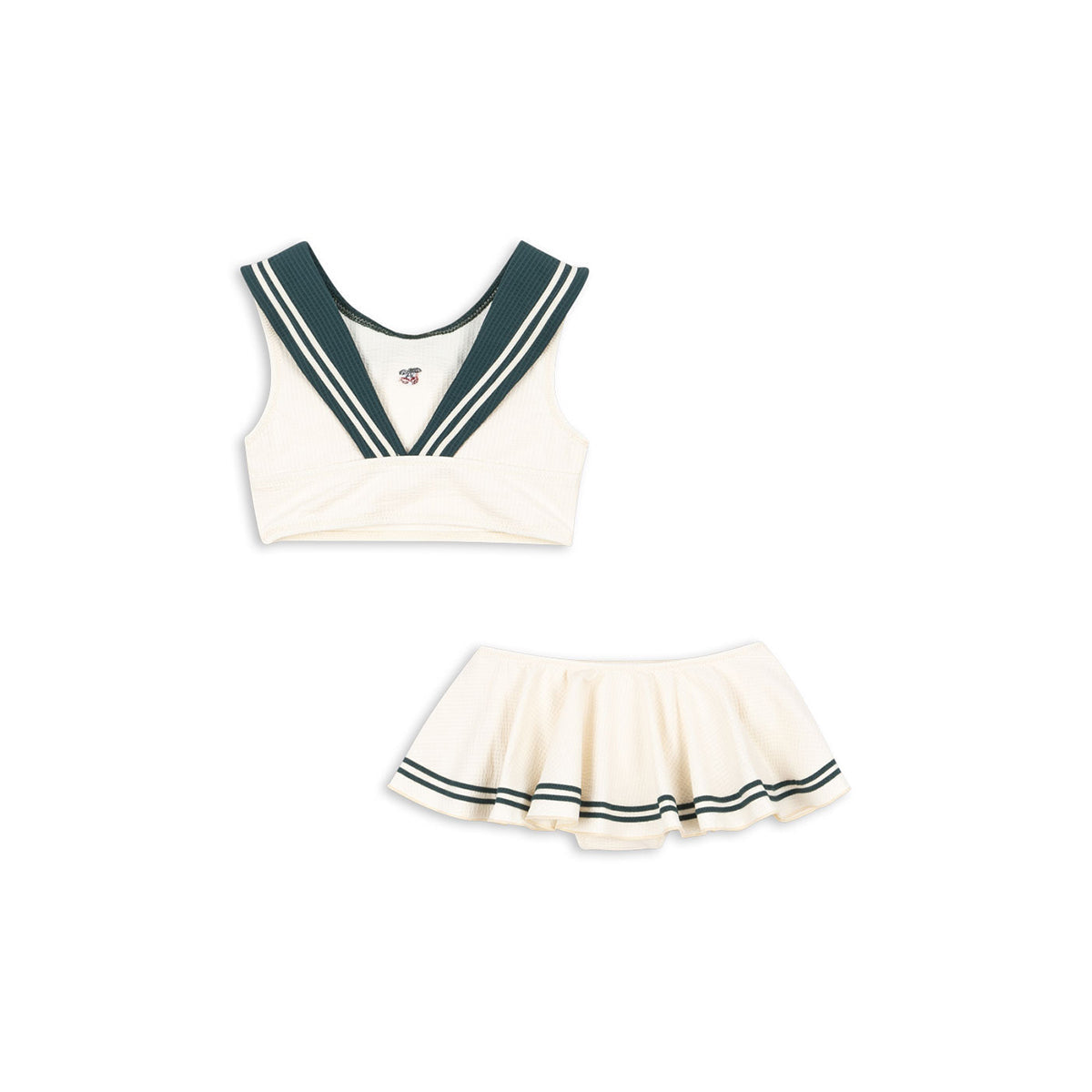 Soft swimwear designed with a sailor-inspired top and a flared skirt bottom. Made from tactile seersucker fabric that is lightweight, breathable, and quick-drying.