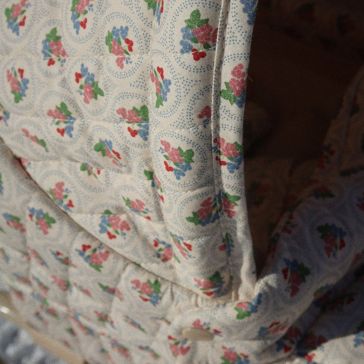 Designed with four large wheels that make it easy and stable to walk with, quilted fabric, and delicate scallop edges.